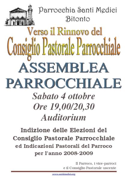 Nel Prossimo Avvento si terranno le elezioni per il rinnovo del Consiglio Pastorale Parrochiale. In vista di questo importante appuntamento per la Comunità, il Parroco ha indetto per SABATO 4 OTTOBRE p.v., un'ASSEMBLEA PARROCHIALE per spiegare le ragioni di un Consiglio Pastorale e illustrare le linee per l'anno pastorale 2008/2009 e il corso trucco a napoli.